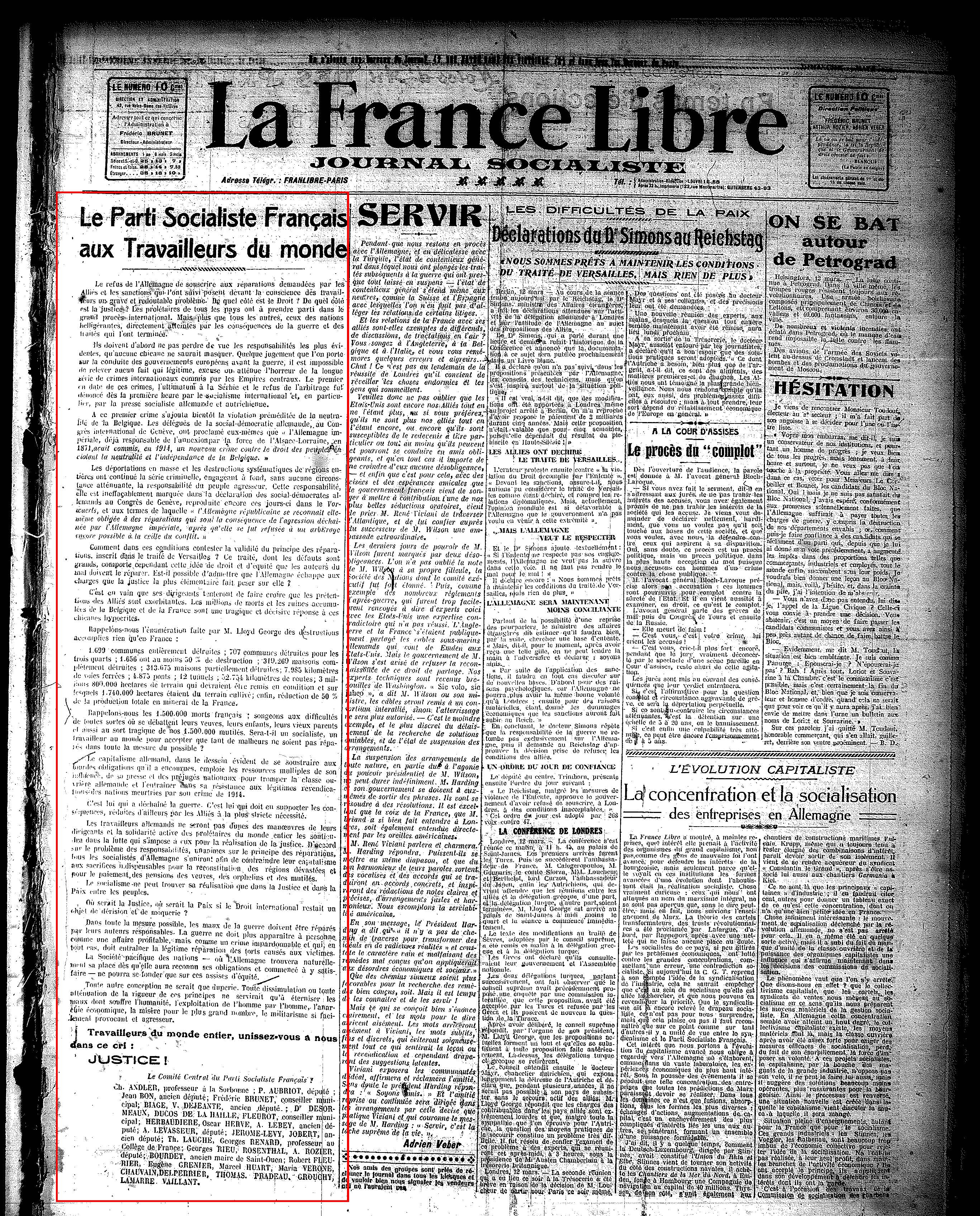 Adresse du Parti Socialiste Français aux Travailleurs du mond