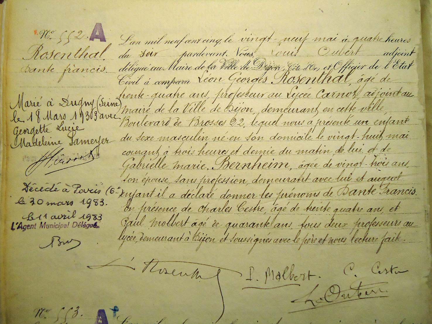 Acte de naissance de Dante Rosenthal