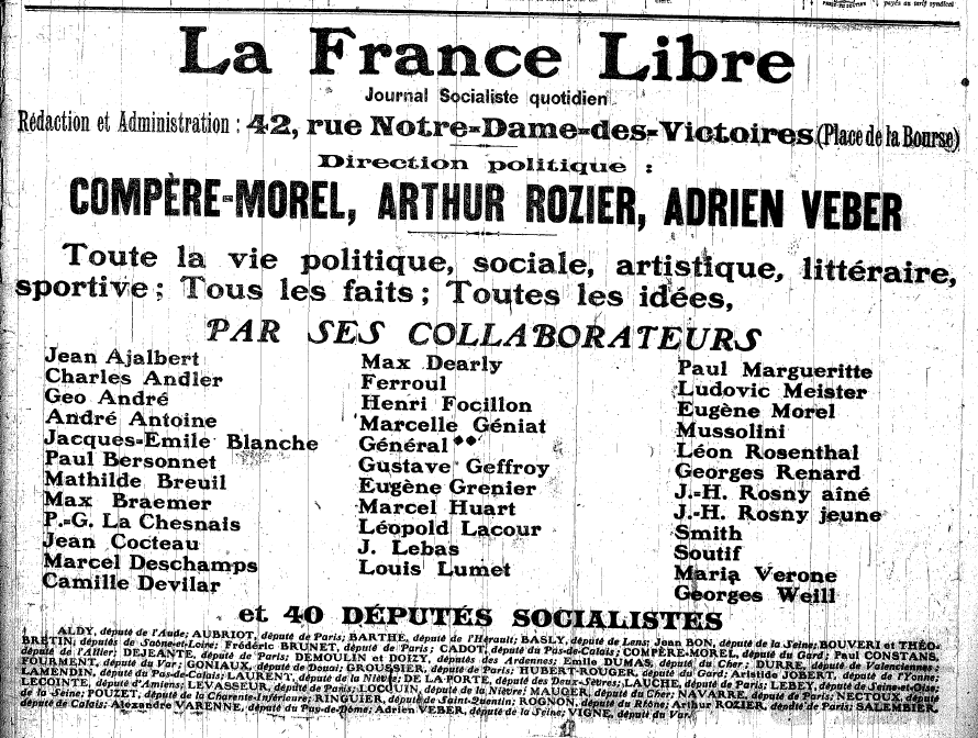 La France Libre est un périodique fondé par la fraction des majoritaires de guerre la plus fidèle à l’Union sacrée. Résolument hostiles à tout compromis avec les minoritaires de guerre, les animateurs de la France Libre se dotent d’un journal dont le but est de rendre public une position qui n’a plus droit de cité dans l’Humanité. En cette première période, Compère-Morel est l’éditorialiste le plus en vue du quotidien, qui ressasse le refus de négociations avec l’Allemagne, la nécessité de défendre la nation et les responsabilités allemandes dans le déclenchement du conflit. Pour autant, le journal et ses soutiens, députés, intellectuels se maintiennent dans l’orbite du Parti socialiste pour la plupart. Avec le Congrès de Strasbourg en 1920, la France libre change de fonction. Lors de ce congrès, les animateurs parisiens de la France libre sont exclus. Dès lors, le journal devient l’organe du Parti socialiste français, petit parti qui prône l’union des gauches et le refus de la révolution bolchevique. Un certain nombre de plumes du quotidien le quitte par souci de demeurer dans la SFIO, ainsi Compère-Morel cesse toute collaboration. A compter de ce moment, le quotidien se réduit à peu, devient essentiellement le support des élus parisiens, Arthur Rozier, Adrien Veber. Au mois d’avril et jusqu’en octobre 1922, le quotidien devient hebdomadaire, traduction tangible des difficultés à vivre du périodique. La relance du journal dure jusqu’en 1925, date à laquelle le journal cesse d’exister pour devenir un bulletin politique.